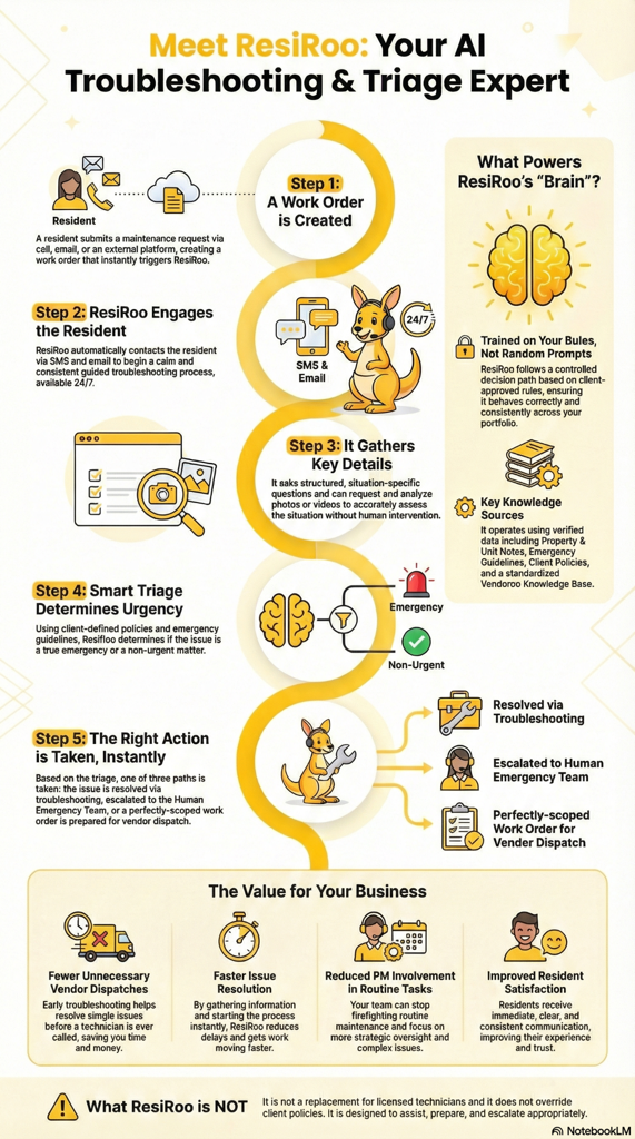 ResiRoo is more than a chatbot—it is a structured AI assistant designed to optimize maintenance operations from the first interaction.
