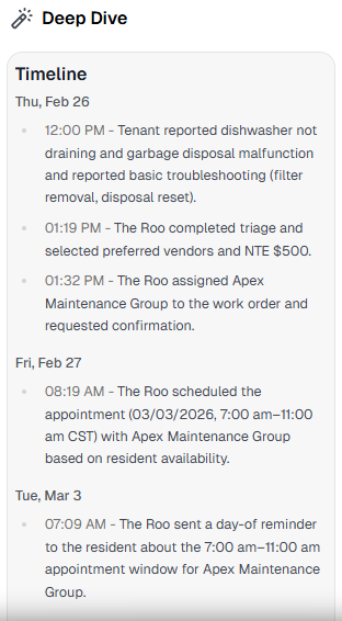 Includes all meaningful moments: initial report, key conversations and outcomes, emergency status changes, vendor assignment/attendance, closure or re-open events, and context-rich notes.