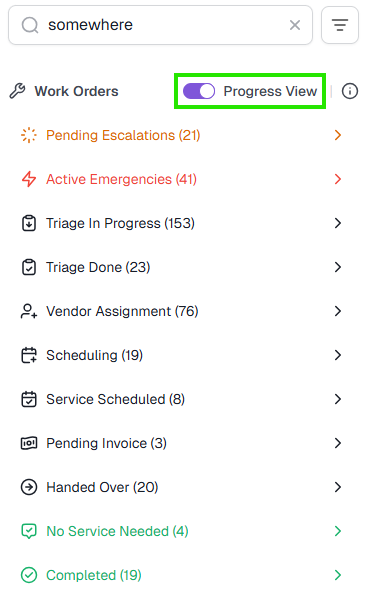 Groups include: Pending Escalations, Emergencies, Triage, Vendor Assignment, Scheduling, No service needed, Completed, and more.