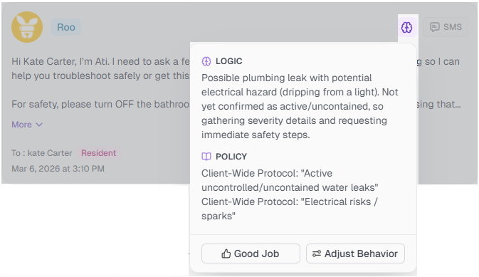 Actions – click “Good Job” to endorse and increase autonomy for your Roo; “Adjust Behavior” to update policy via chat.