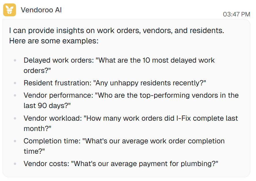 Ask natural questions—e.g., longest open work orders, resident sentiment trends, vendor performance, or average resolution time.