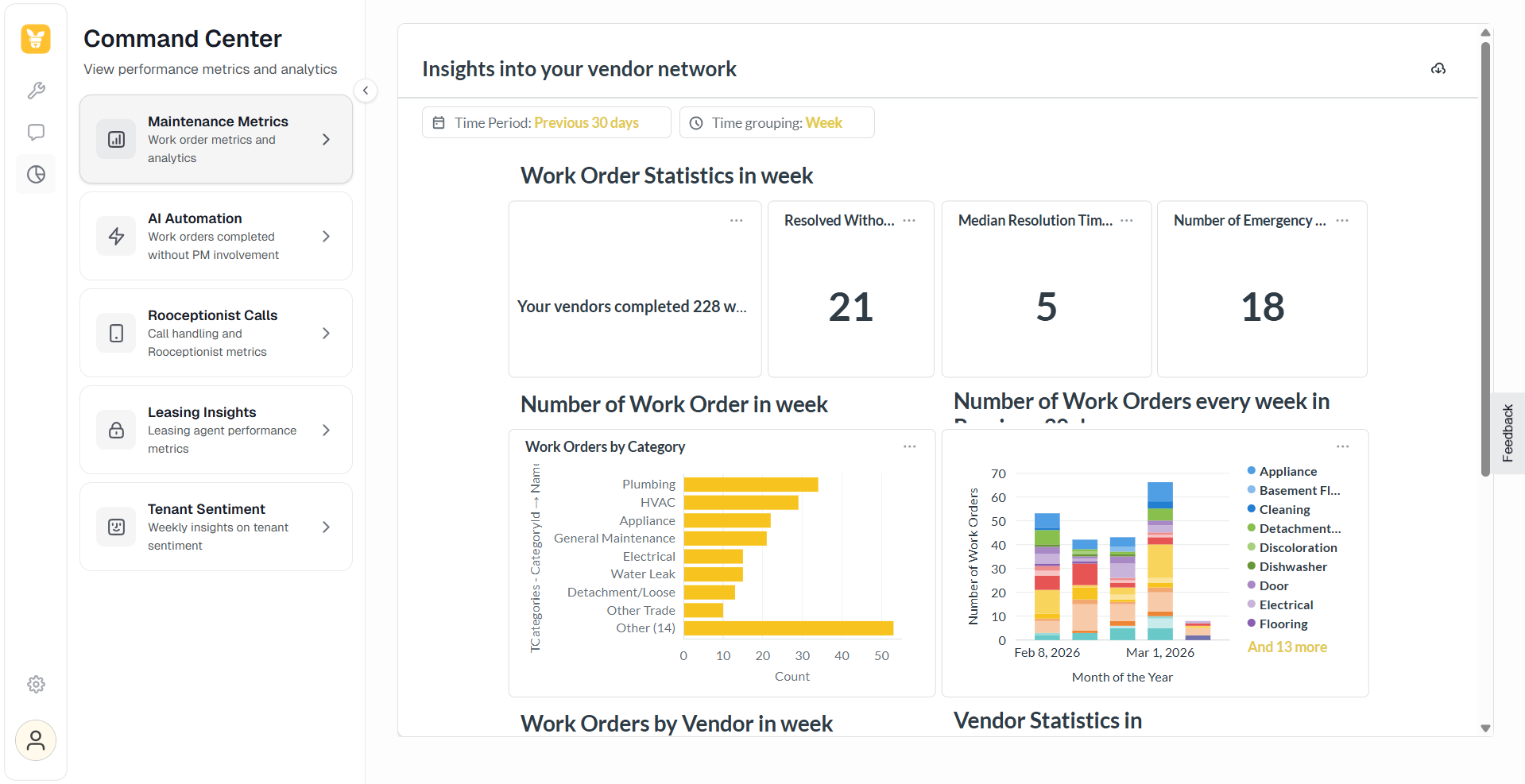 A centralized view of property operations, featuring real-time analytics for maintenance, AI-driven automation, call handling, leasing performance and weekly tenant sentiment to help property managers optimize their service quality.